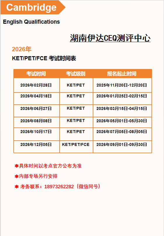 2026年湖南伊达CEQ剑桥英语五级考试时间